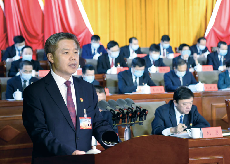 董曉宇代表中共承德市第十四屆委員會向大會作報(bào)告。本網(wǎng)記者 陳琦嘉 王立群 攝