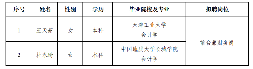 因公司發(fā)展需要,承德市建設(shè)投資有限責(zé)任公司委托第三方機(jī)構(gòu)面向社會(huì)公開招聘前臺(tái)兼財(cái)務(wù)崗員工?,F(xiàn)對(duì)擬錄用人員信息進(jìn)行公示,公示期間如有異議,可通過(guò)電話、信函等方式反映,反映意見請(qǐng)署真實(shí)姓名。